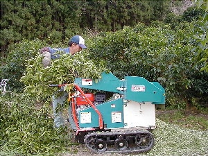 :剪定で切り取った枝の破砕機でのチップ作業状況